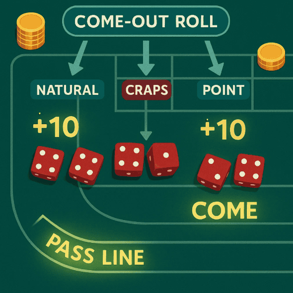 • Craps (2, 3 oder 12) – Der Shooter verliert sofort seine Pass-Line-Wetten. Trotz des Namens endet die Runde hier nicht; die Würfel können an einen neuen Shooter weitergegeben werden oder es kann ein neuer Come-Out-Wurf beginnen, je nach Spielverlauf am Tisch.